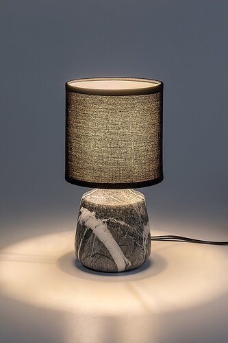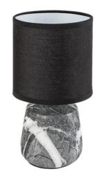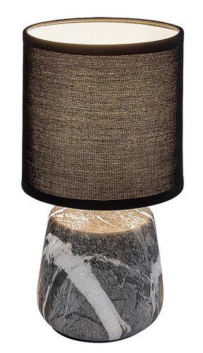 Stona lampa Rabalux Nalisa preporučuje se onima koji vole lampe sa prirodnim efektom i skladnim izgledom. Ova moderna noćna lampa ima cilindrično keramičko telo u sivo-beloj mermernoj imitaciji, upotpunjeno crnim tekstilnim abažurom cilindričnog oblika, otvorenim na vrhu i dnu. Odličan je izbor za spavaću ili dnevnu sobu, postavljena na noćni ormarić ili sto. Tamni abažur pruža diskretno osvetljenje, tako da je ova stona lampa dobar izbor ako noću treba da uključite svetlo, ali ne želite da probudite partnera. Radi sa jednom sijalicom snage do 40 W. Tip grla je E14. Keramička noćna lampa ima crni kabl i prekidač na kablu. Isporučuje se bez izvora svetlosti.